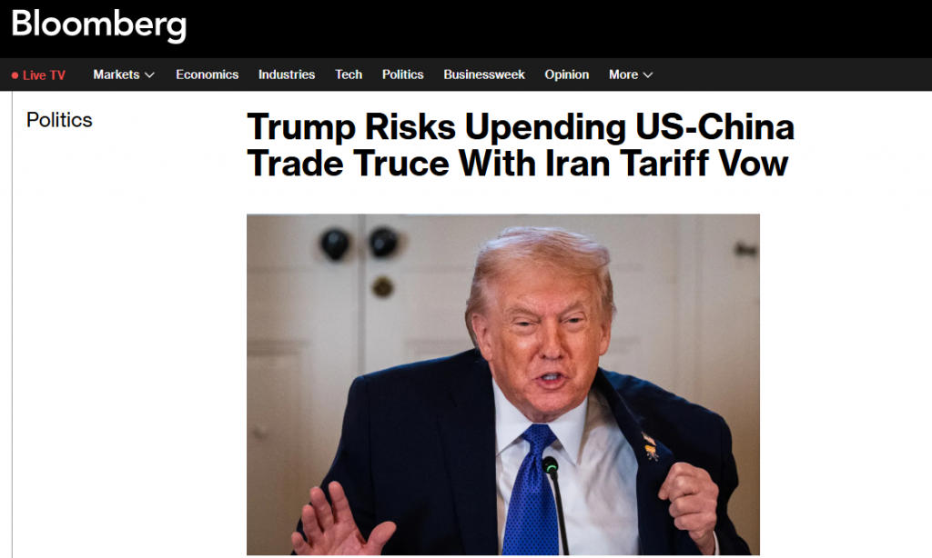 Trump risks Upending US-China Trade Truce with Iran Tariff Vow.