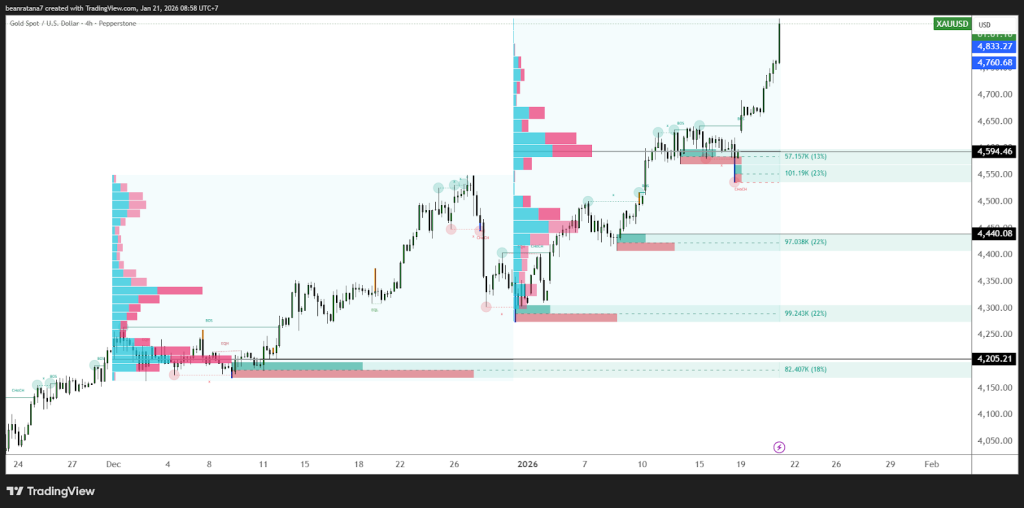 Gold is currently trading at $4828.57, continuing its bullish momentum amid the Geopolitical Tensions. The chart reveals a strong buying pressure late December 2025 after a pullback.