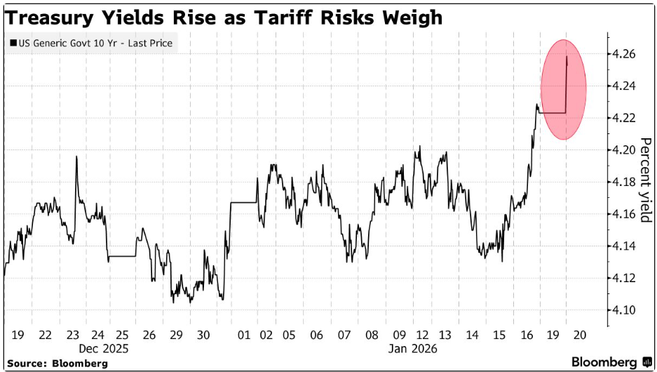 According to Bloomberg, “ Treasuries joined a selloff in global bonds as the threat of US tariffs relating to Greenland undermined demand for American assets and added to concerns about Washington’s long-term fiscal position”. The recent global bond selloff, led by US Treasuries, highlights rising investor concern over political and fiscal risks rather than improving economic fundamentals. Renewed US tariff threats linked to Greenland have revived fears of trade escalation, undermining confidence in American assets and raising uncertainty around long-term debt sustainability.